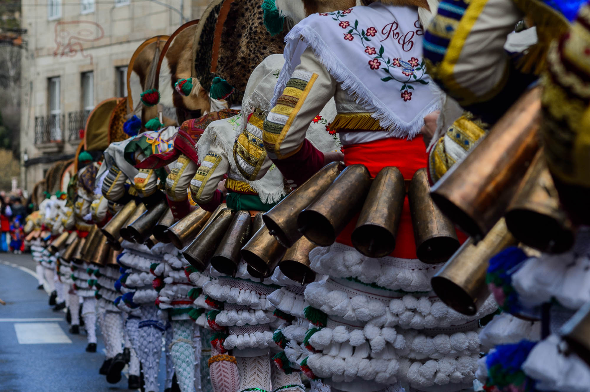 Carnival in Verin, Ourense-Galicia (Spain), known regionally as Entroido (entrance). The main character of the Carnival is the «Cigarrón» (a masked figure who dress in colorful clothes with cowbells around their waist who run through the city streets). The costume weights 25kgs and the mask is made of wood. It is not clear the origin about this ancestral Carnival but it could be from archaic root and then mixtures in Roman times with others of social kind that endure till The Middle Age, getting by then a Cristian way. Both manifestations together, pagan and Cristian, make the Carnival as we know it nowadays.